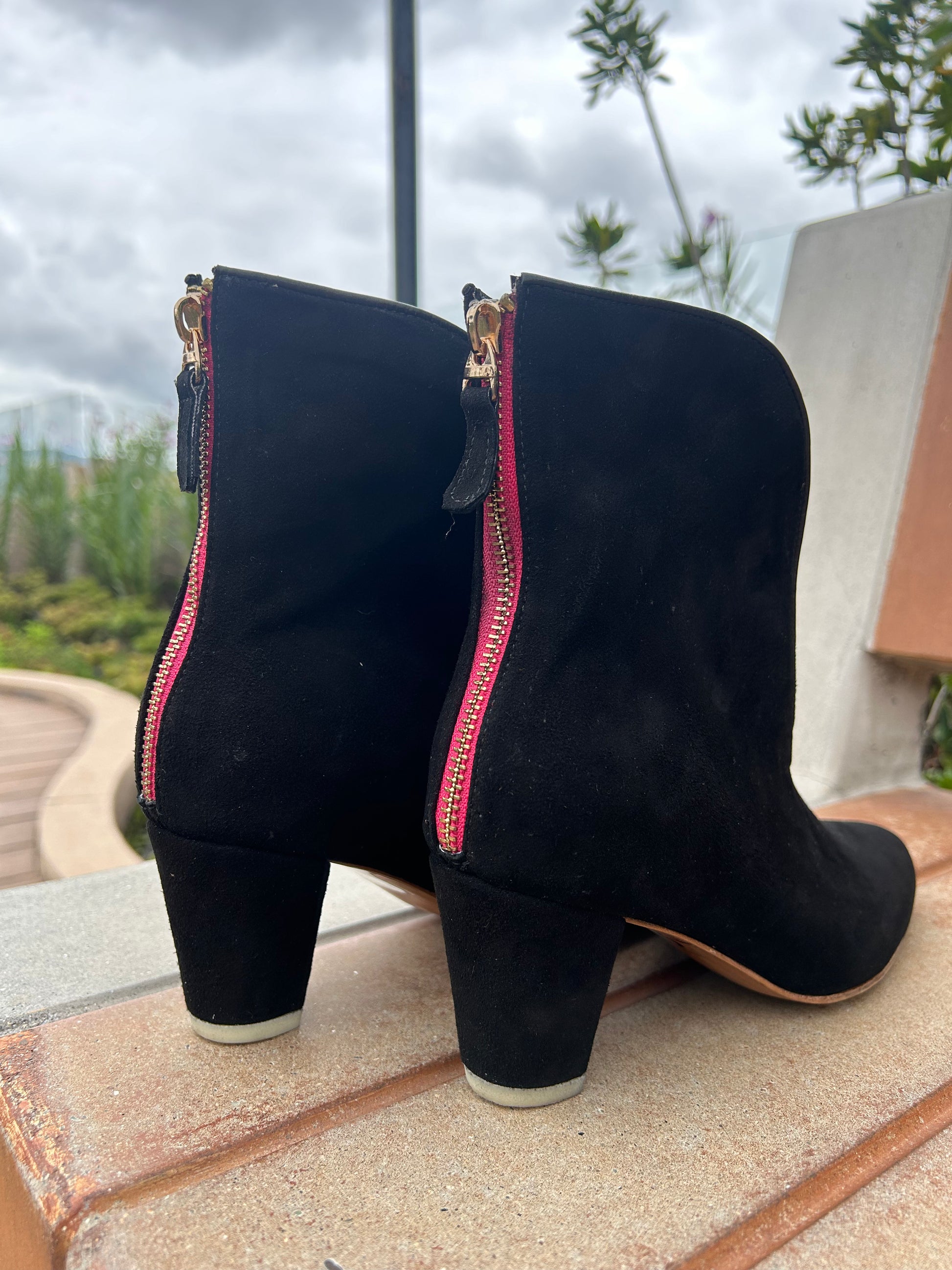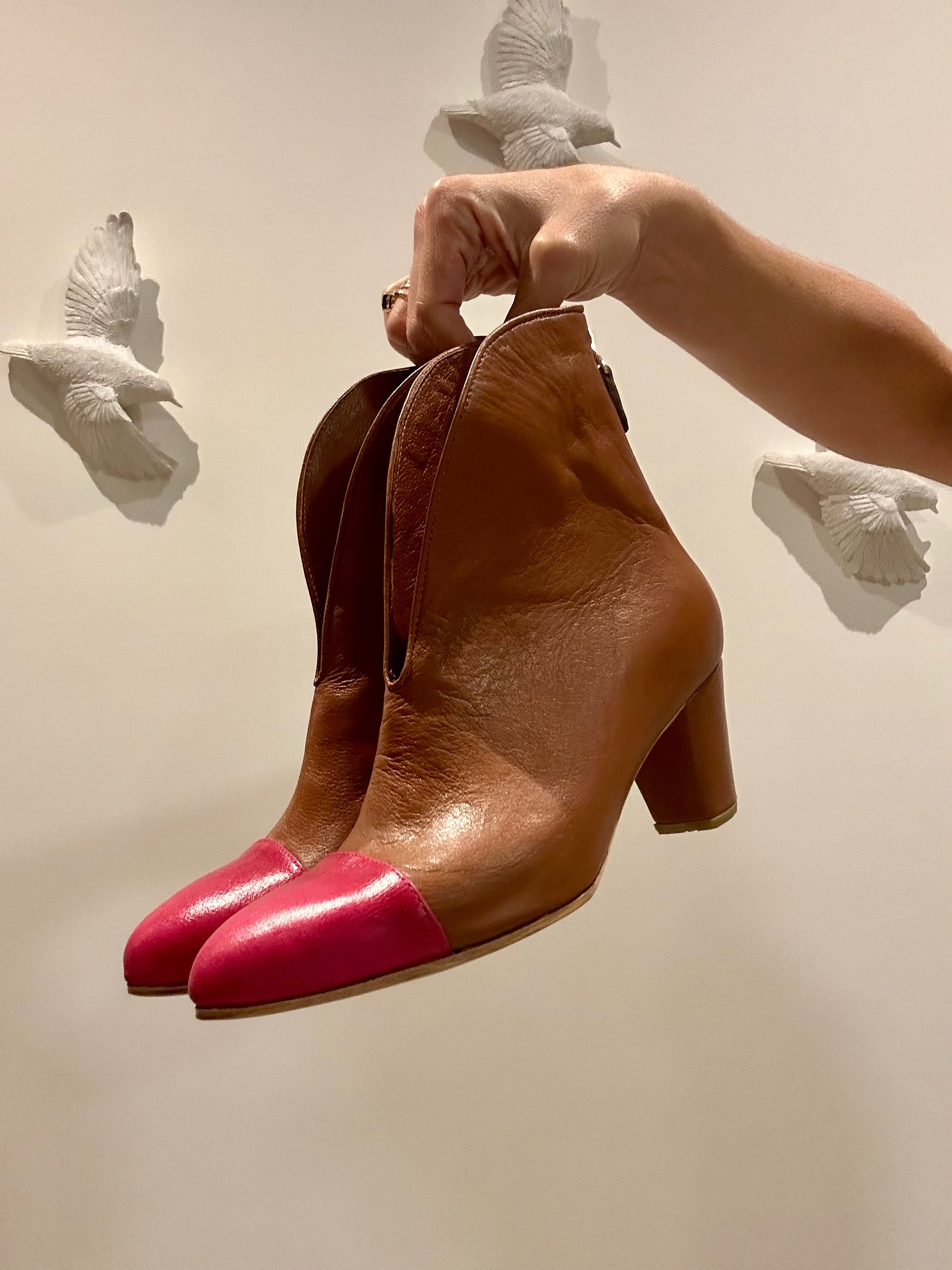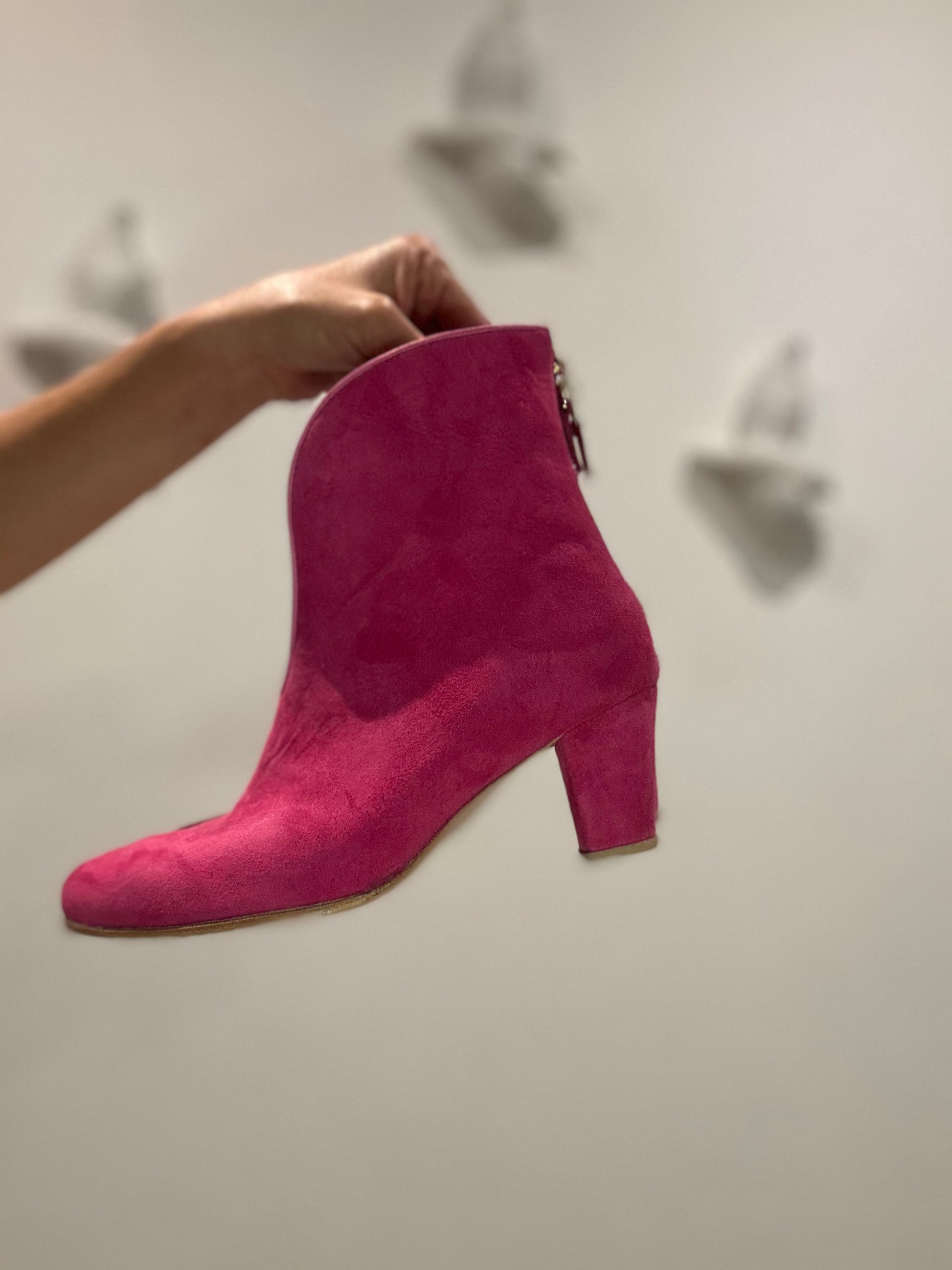 Pensando en la comodidad de nuestras clientas, diseñamos las TULIP pero con un tacón más bajito (6.5 cm). Los botines mantienen su diseño estilizado y están disponibles en variados colores! Estos botines son hechos a mano en gamuza o cuero, unicolor o combinados (la punta en un color diferente al resto del zapato). Tienen abertura frontal que estiliza mucho el look y tiene una cremallera trasera en fucsia que le añade un detalle diferente.